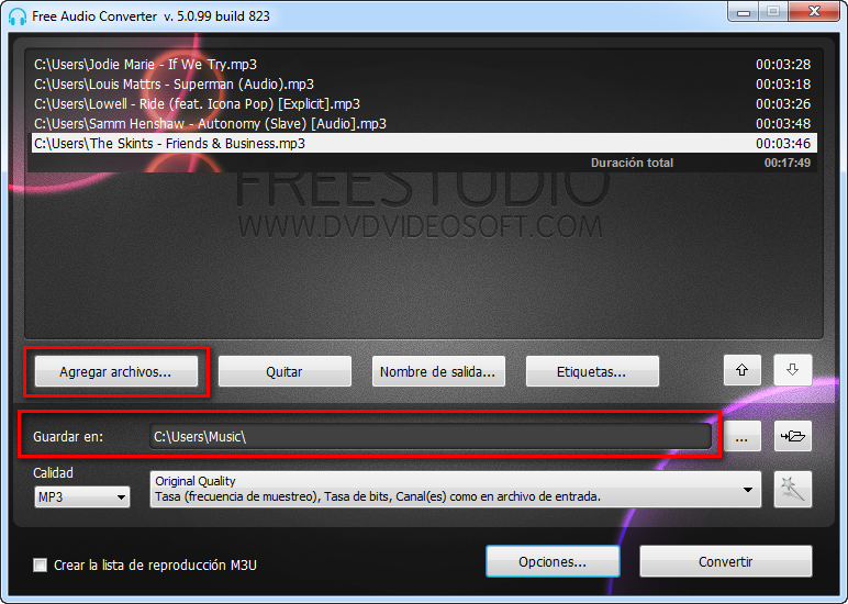 Inicio > Todos los programas > DVDVideoSoft > Programs > Free Audio Converter o simplemente haz clic en el acceso directo a DVDVideoSoft Free Studio desde el escritorio.La interfaz es muy sencilla y contiene explicaciones. Hay un campo para los archivos de entrada, un campo para la ruta de salida y una lista con perfiles predeterminados. Si quieres cambiar el tema predeterminado, sigue Opciones → Tema.